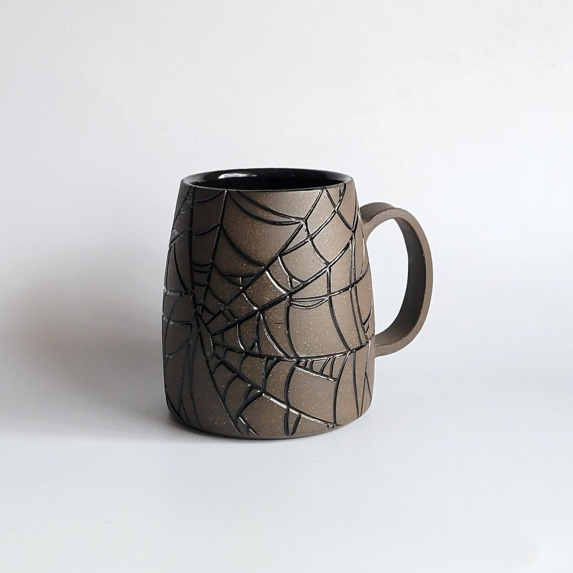 These are by far my favorite design to make with dark clay. The simplicity of the color and lines hold a quiet elegance, and light glistens off the webbing. This wheel-thrown mug is made with dark stoneware clay and webs are carved when the clay is leather hard. A glossy black glaze lines the interior and is inlaid in the webbing.