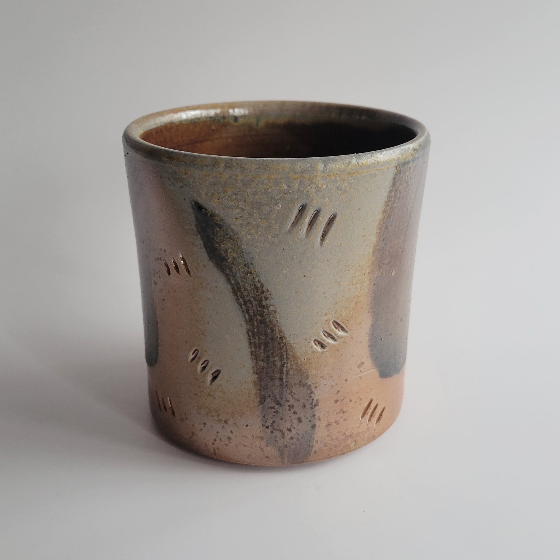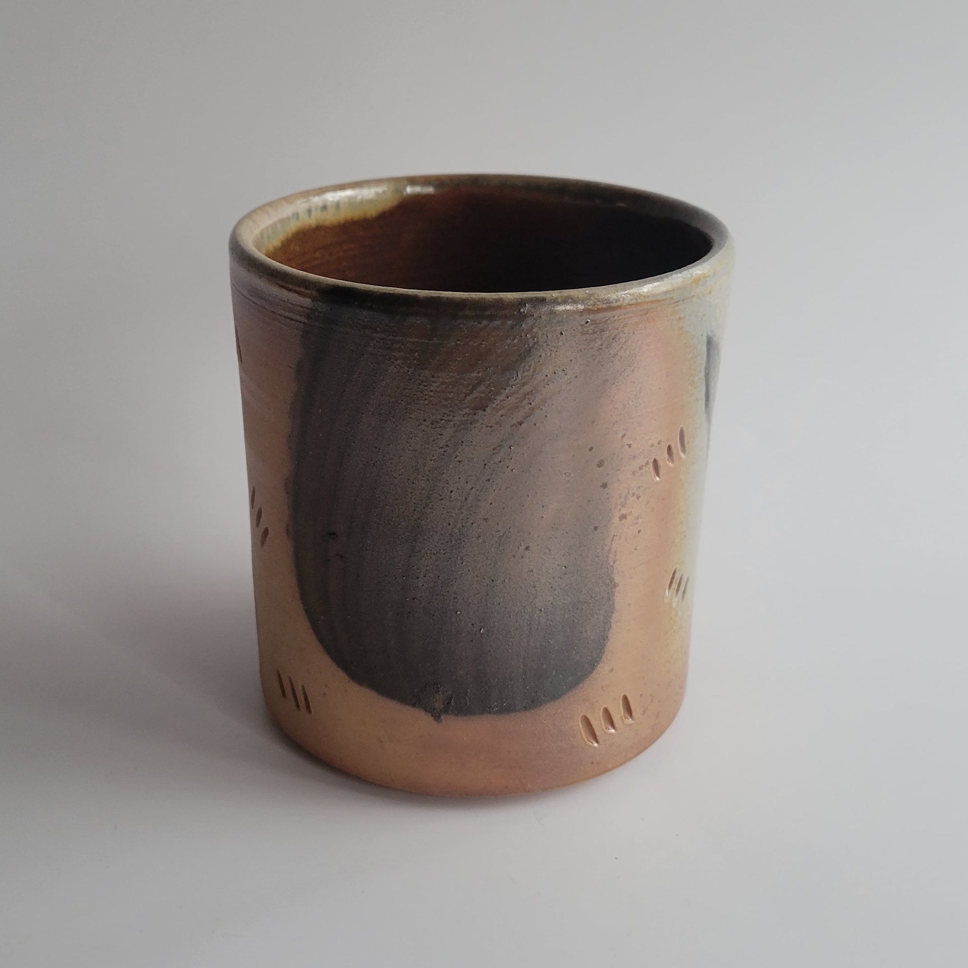 This cup was thrown on the wheel with cone 10 stoneware, and decorated with purple underglaze and carved. The outside was left unglazed and the interior has a dark reddish-brown satin liner. The color variation and texture are a result of the atmospheric firing.